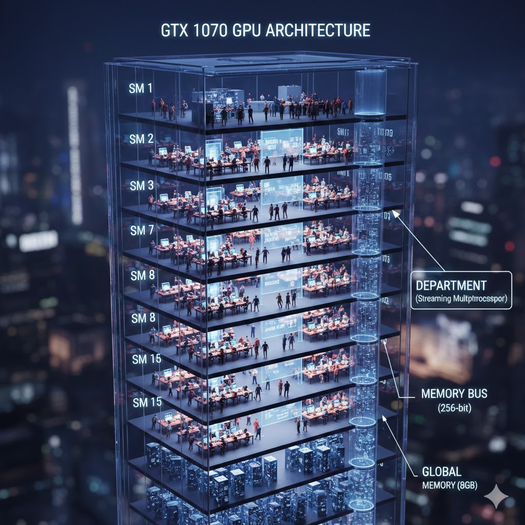 To understand these specs, I like to imagine my GTX 1070 not as a circuit board, but a massive, highly disciplined corporate headquarters.